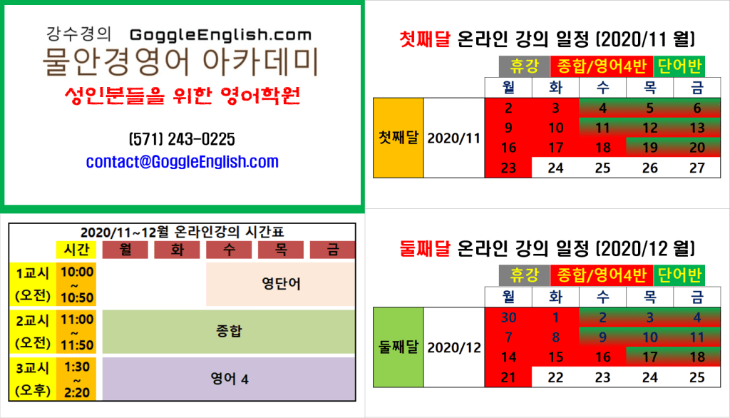 수강문의 및 신청은 아래의 폼을 사용하거나, 이메일(contact@GoggleEnglish.com), 전화(571-243-0225), 또는 카톡(skkang26) 으로 연락주세요.